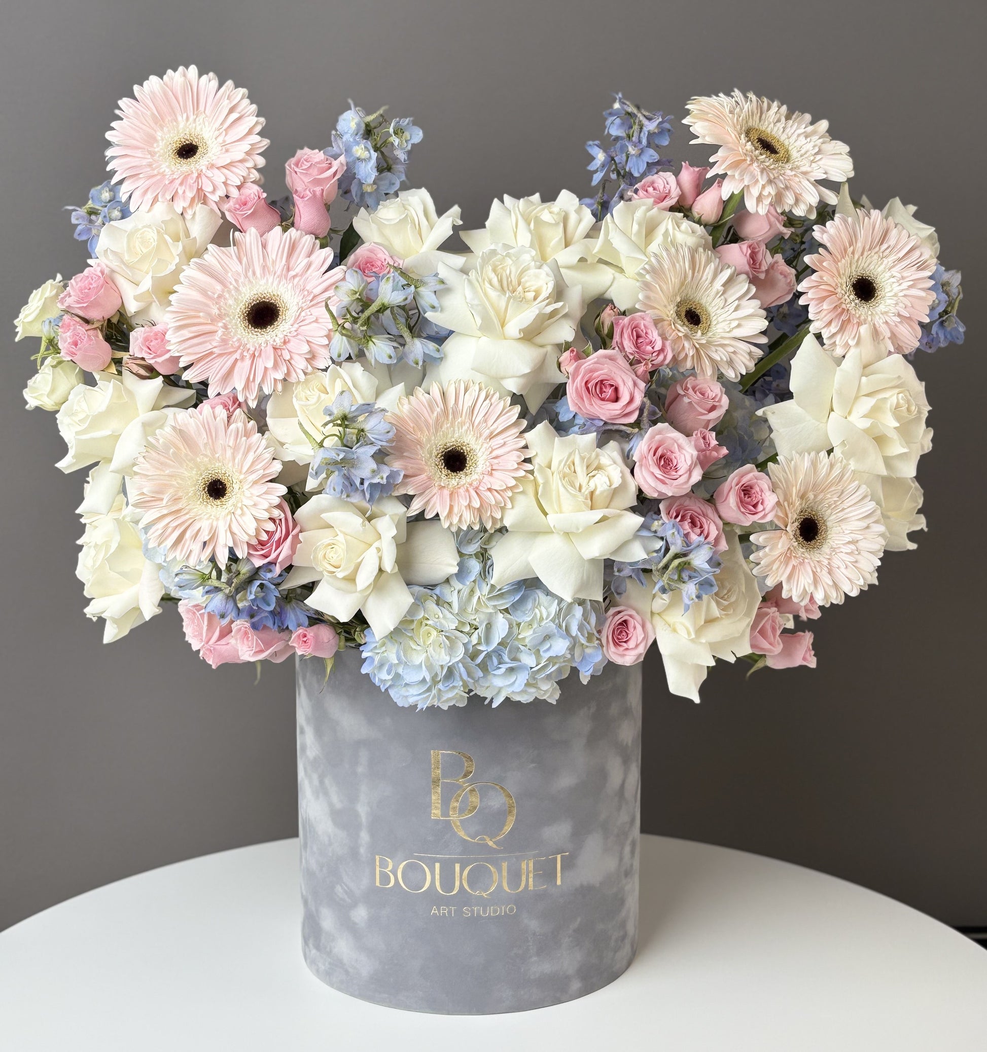 An elegant arrangement in a graphite velvet hat box with the signature gold BQ BOUQUET logo. Subtle in tone yet rich in form, this bouquet features blush gerberas, white roses, spray roses, blue hydrangeas, and delphiniums.