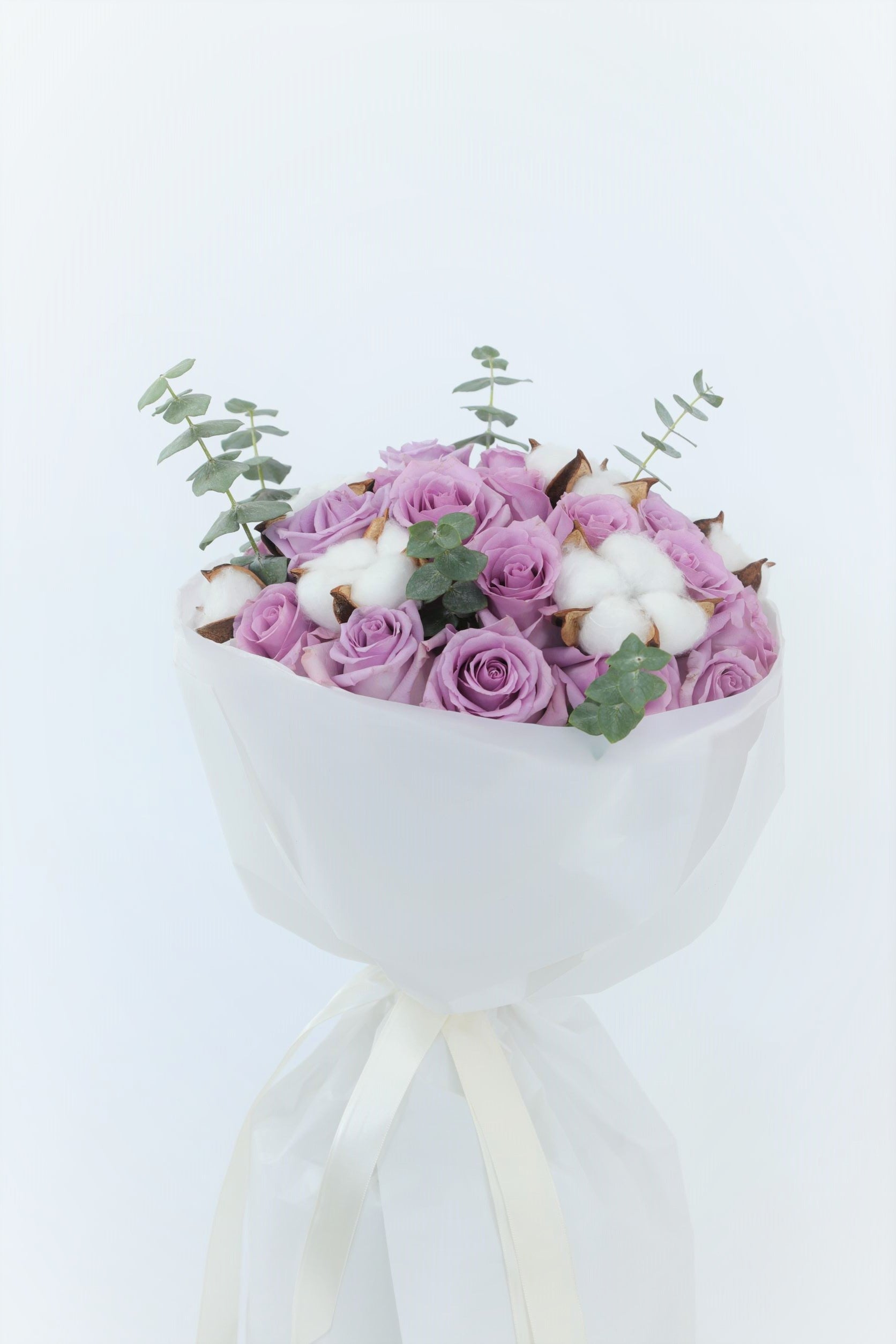 This beautiful classic bouquet includes lavender roses and white cotton, eucalyptus. It is beautifully packaged in a luxurious handbag in a European manner.