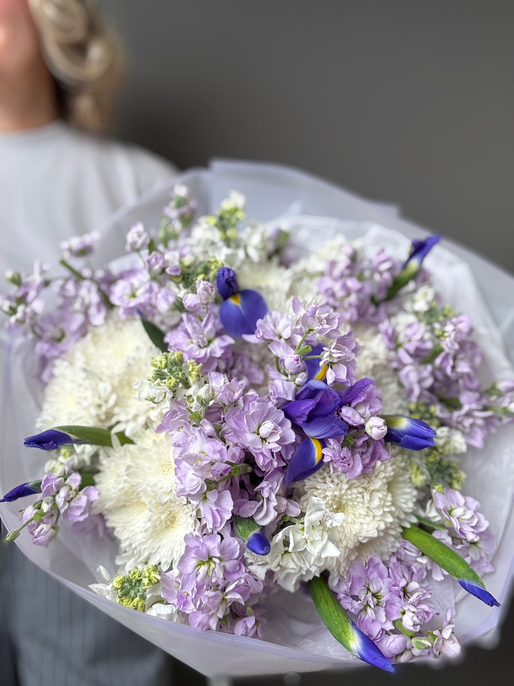 Luxury spring bouquet featuring delicate lavender stock flowers, white chrysanthemums, and elegant blue iris accents. This airy and romantic arrangement is perfect for birthdays, anniversaries, baby showers, bridal showers, thank you gifts, and luxury floral decor. Handcrafted by BQ Bouquet and available for flower delivery in Newport Beach and Orange County.