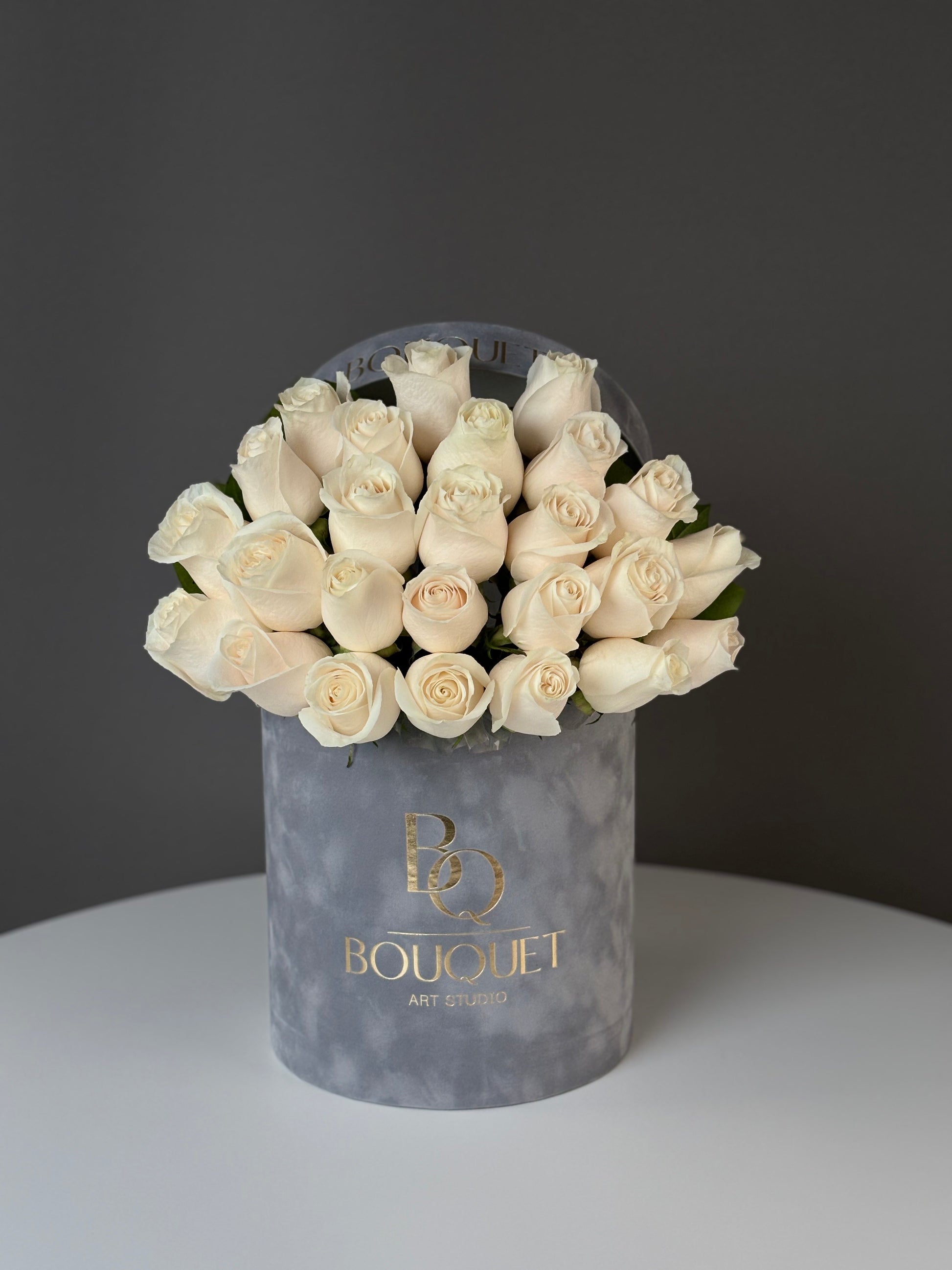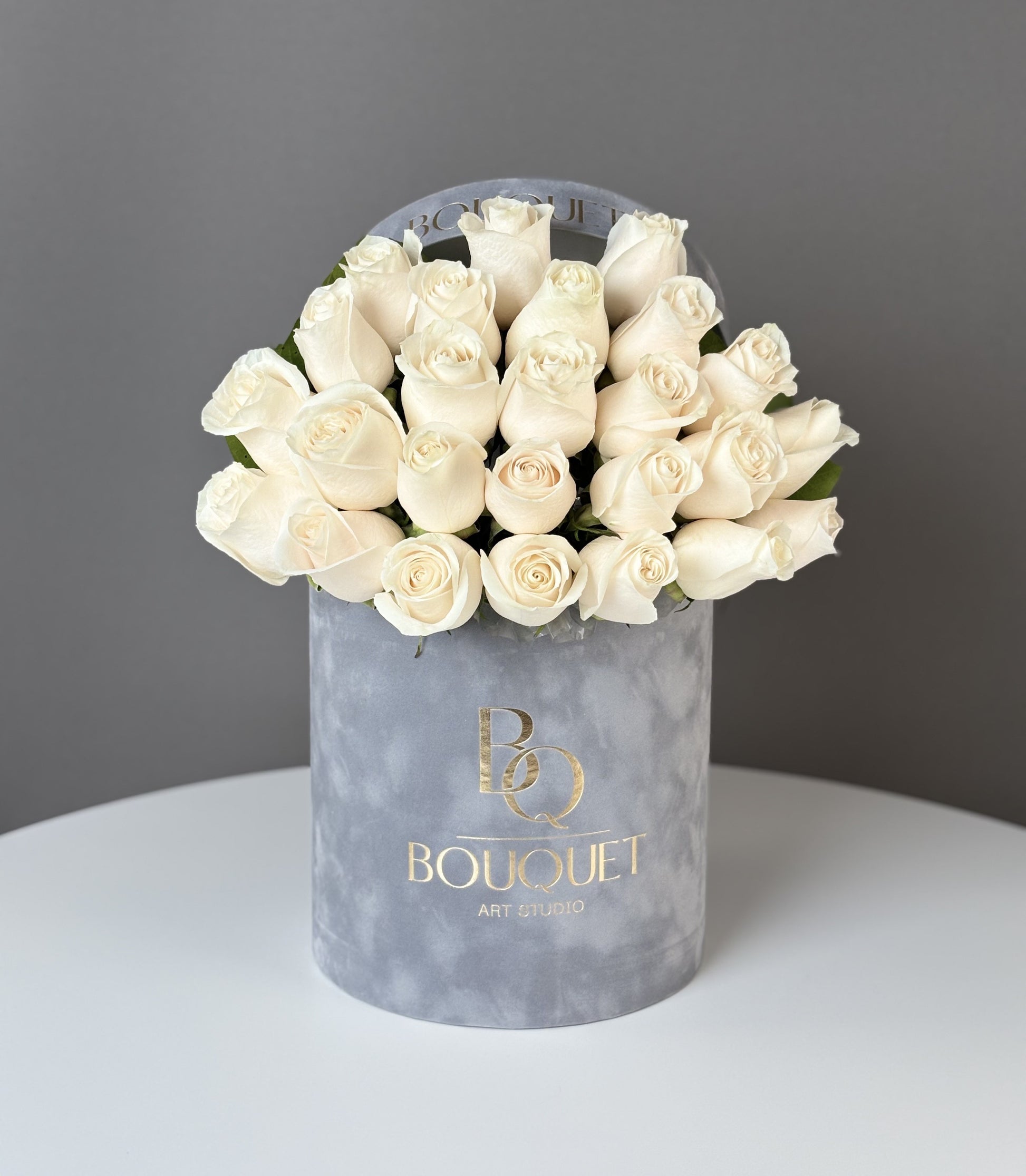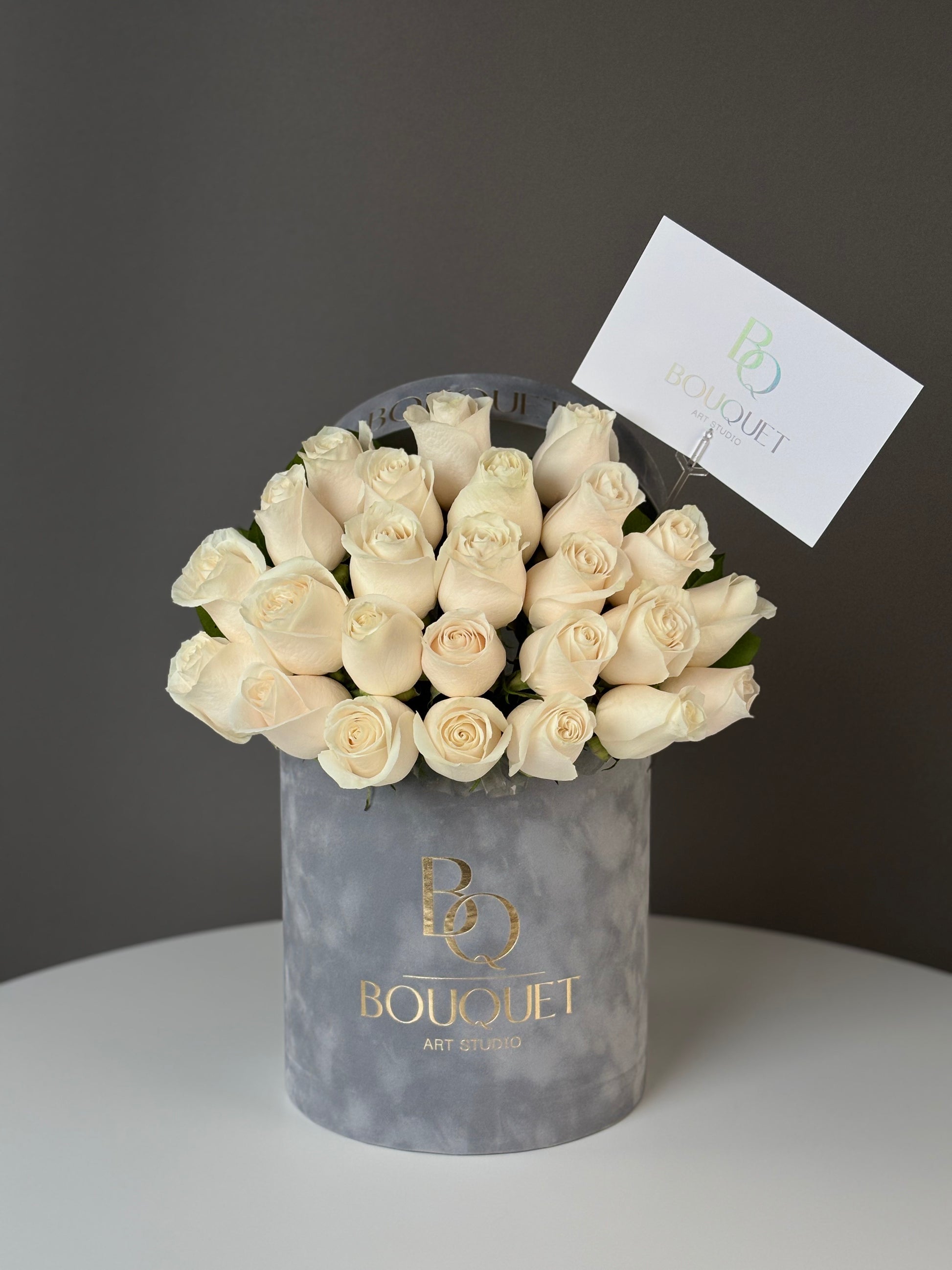 An ethereal bouquet of white roses in a velvet-textured box inspired by polished grey marble. The soft, clouded pattern adds depth and quiet luxury, making this arrangement feel both modern and timeless.