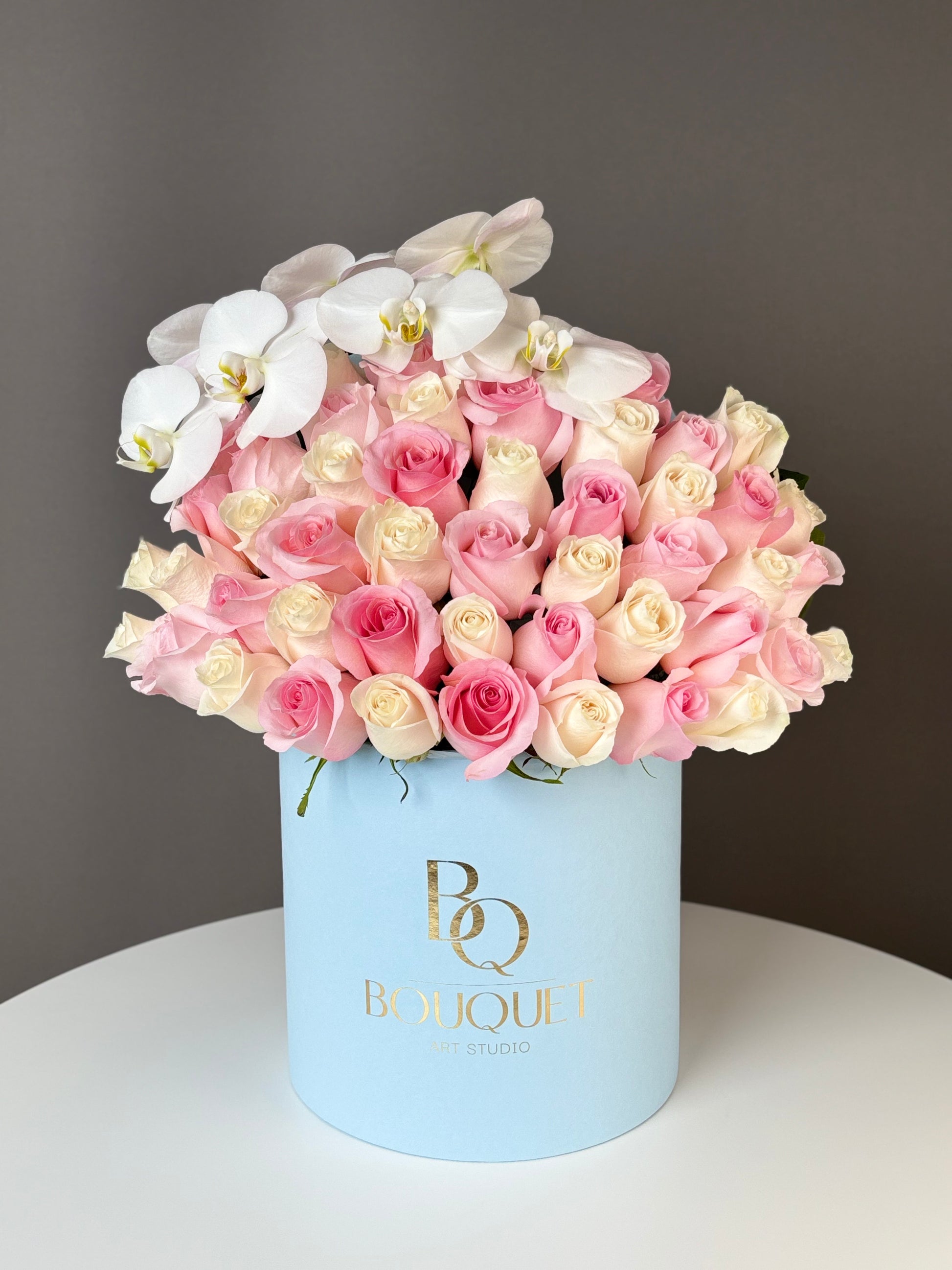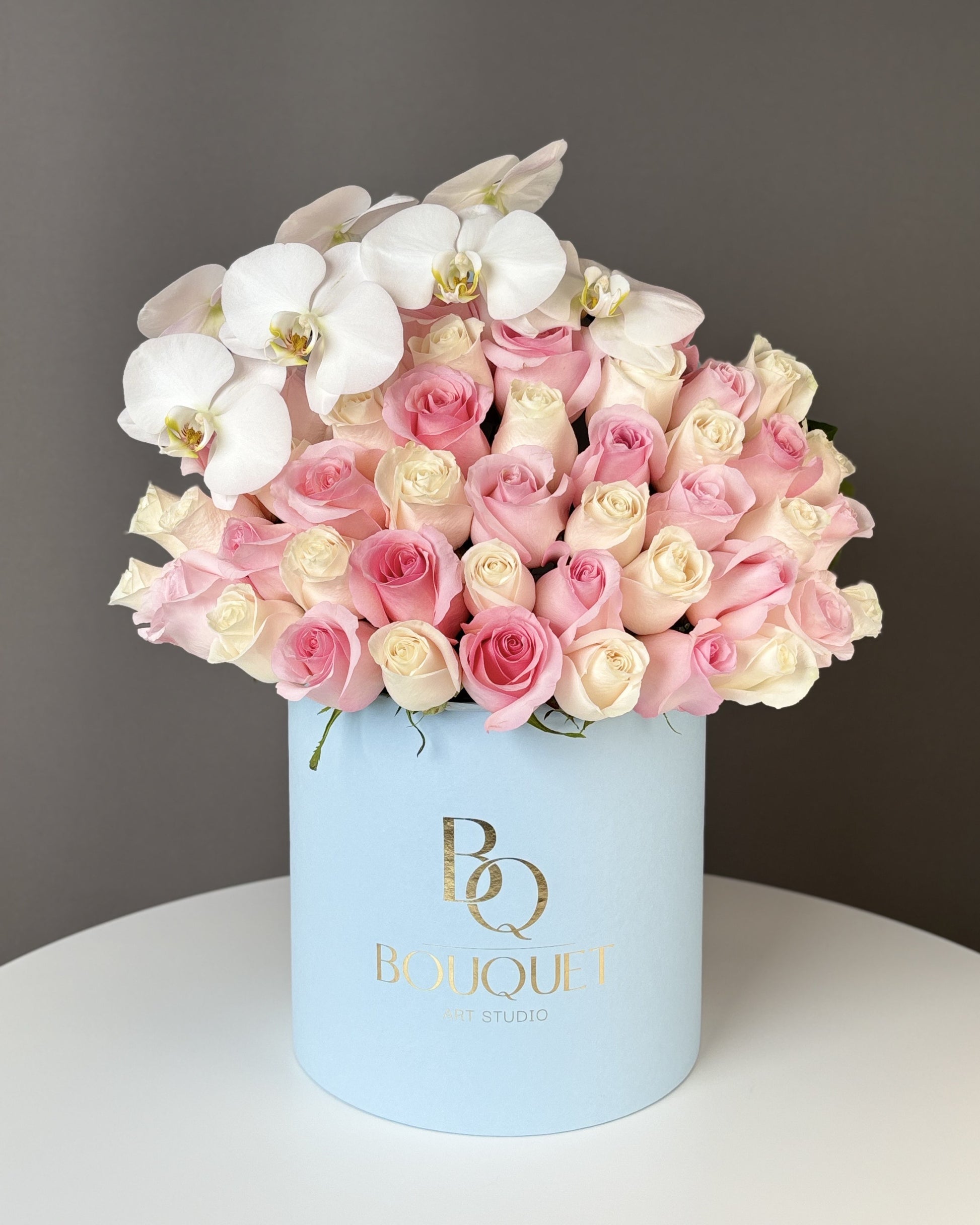 An exquisite harmony of blush and ivory roses, delicately adorned with a cascading white orchid stem. Presented in our signature light blue hat box with gold foil accents, Orchid Mist evokes purity, elegance, and serenity — a floral statement that feels both luxurious and serene.