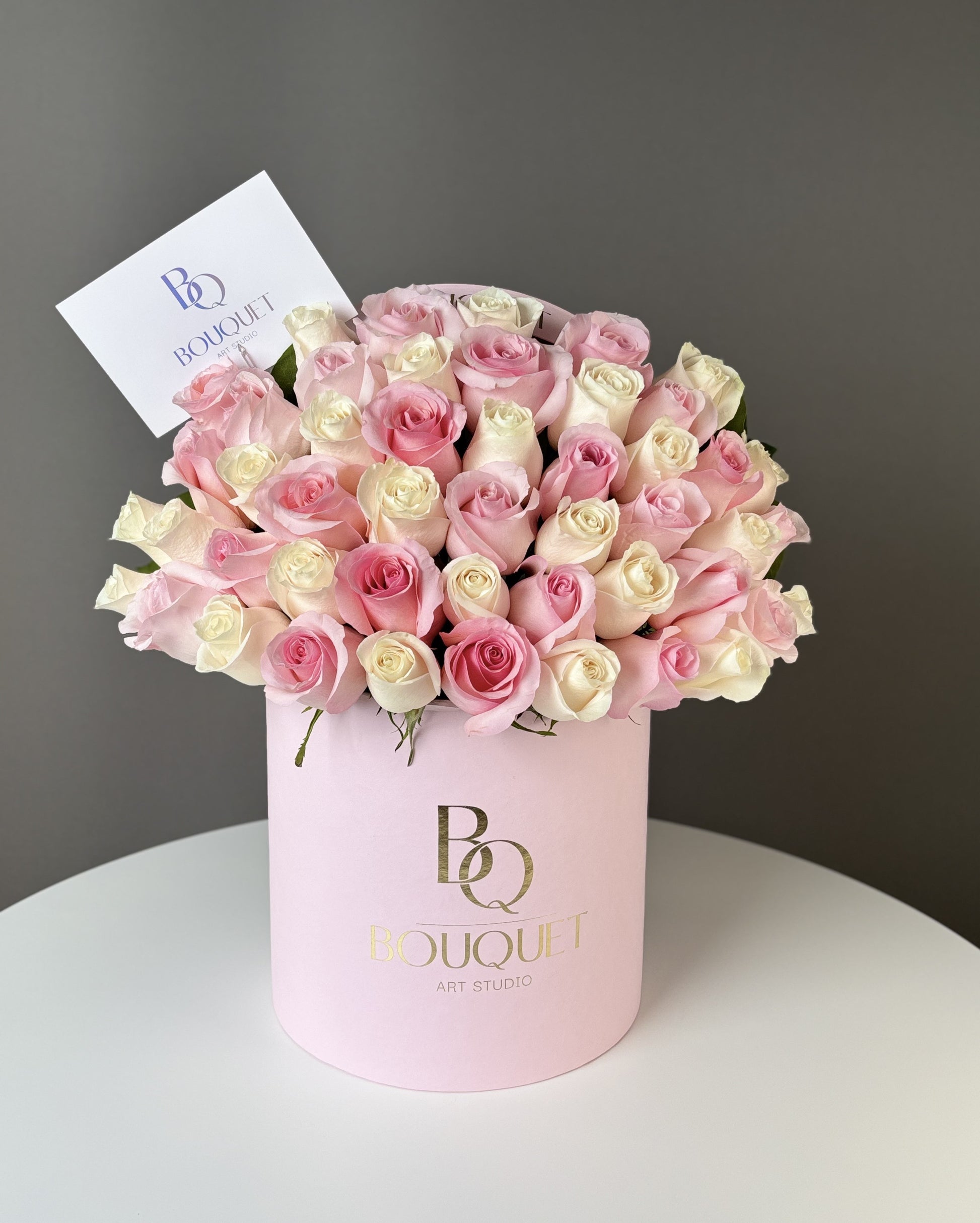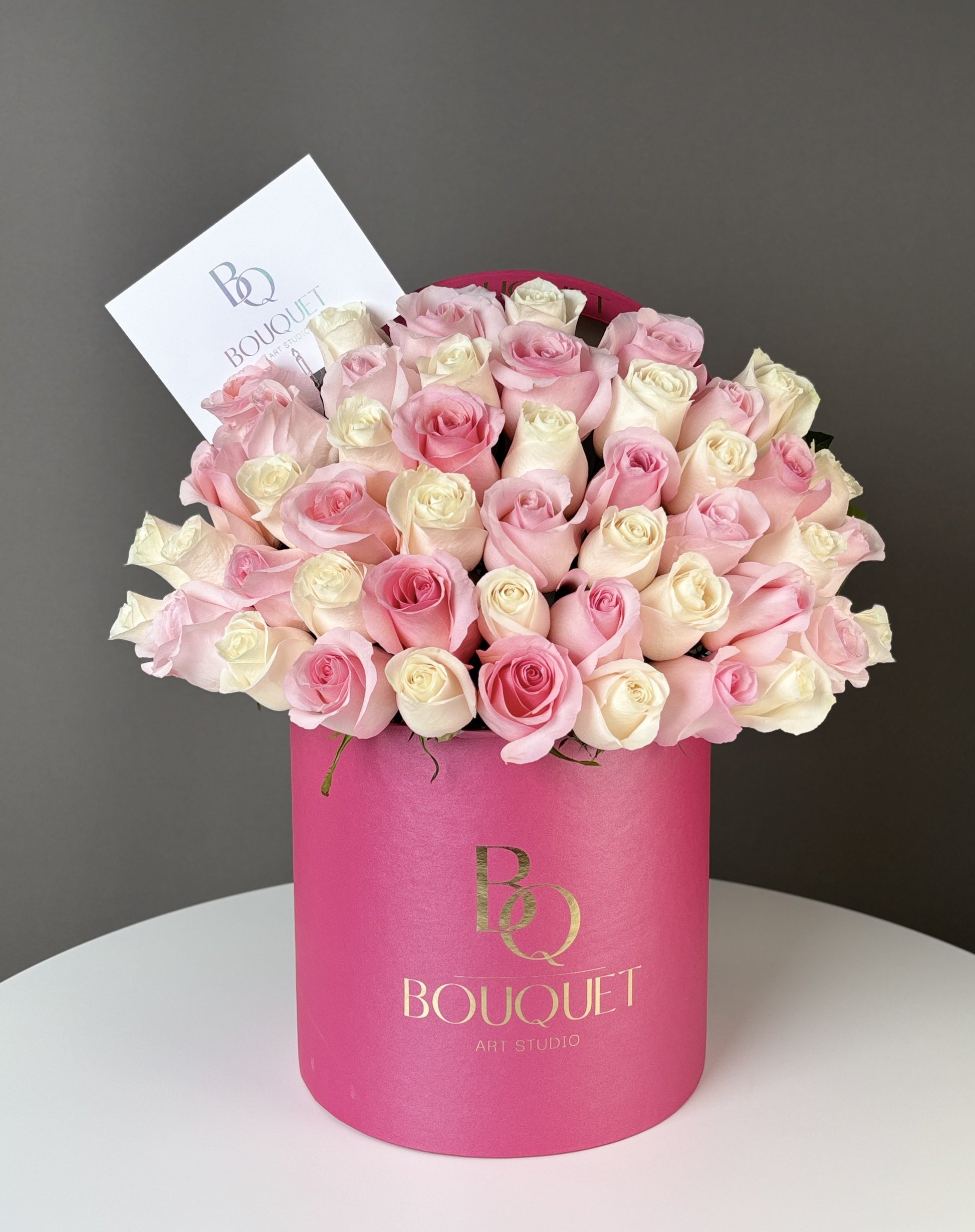 A dreamy blend of pastel pink and ivory roses, artistically arranged in our signature hat box with gold embossed logo. Pink Meringue is a tribute to softness, femininity, and quiet luxury — the kind of gift that makes hearts melt.