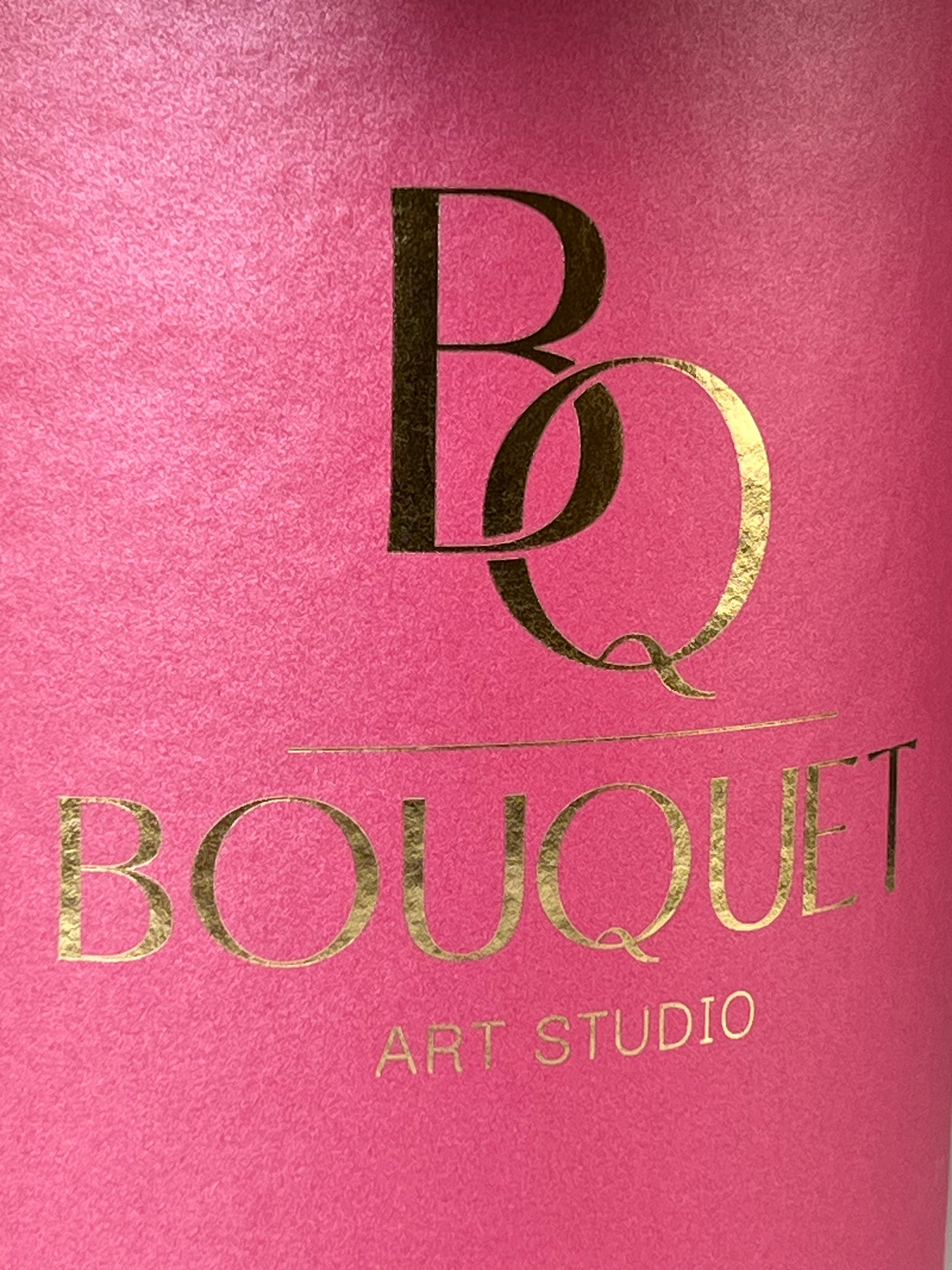Premium paper hat box with a pearlescent glow and the signature gold BQ BOUQUET logo.