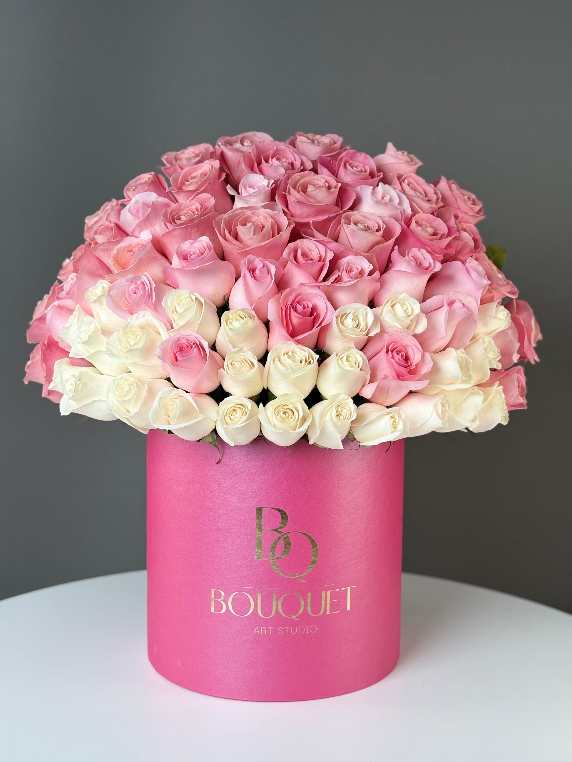 An exquisite ombré blend of Ecuadorian roses, transitioning from creamy ivory to soft blush and rich pink — creating a romantic gradient with timeless appeal. Arranged in our velvet hot pink hat box with gold-foil BQ logo, Rosé Luxe Ombre is a bold, feminine centerpiece designed to captivate and impress.