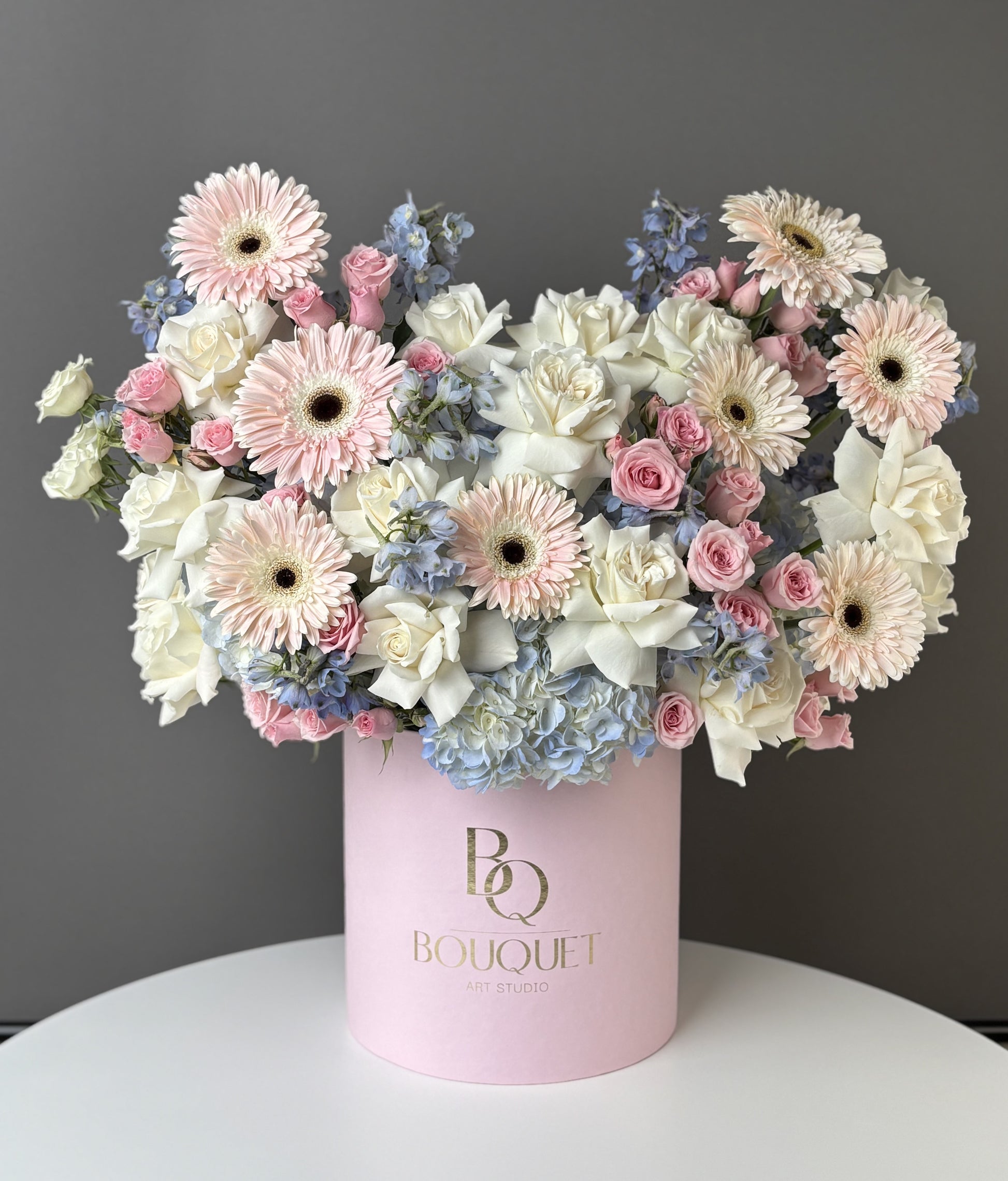 A soft and airy arrangement, like a floral dessert — featuring white roses, blush pink gerberas, spray roses, blue hydrangeas, and delicate delphiniums.