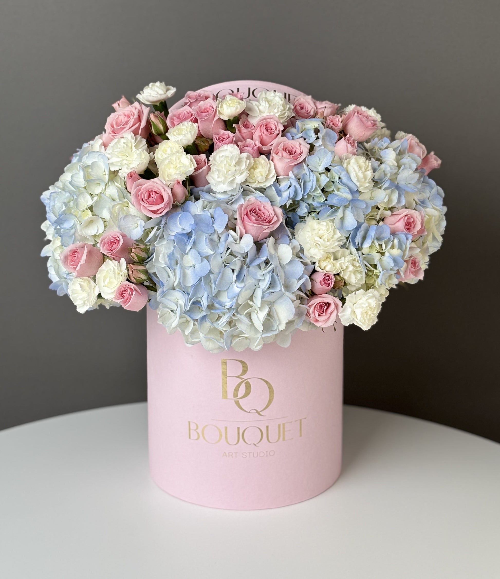 A soft and romantic arrangement featuring blue hydrangeas, blush pink spray roses, and white spray carnations. The voluminous hydrangeas set a delicate base, while the roses bring a touch of romance and the carnations add elegant texture and structure.