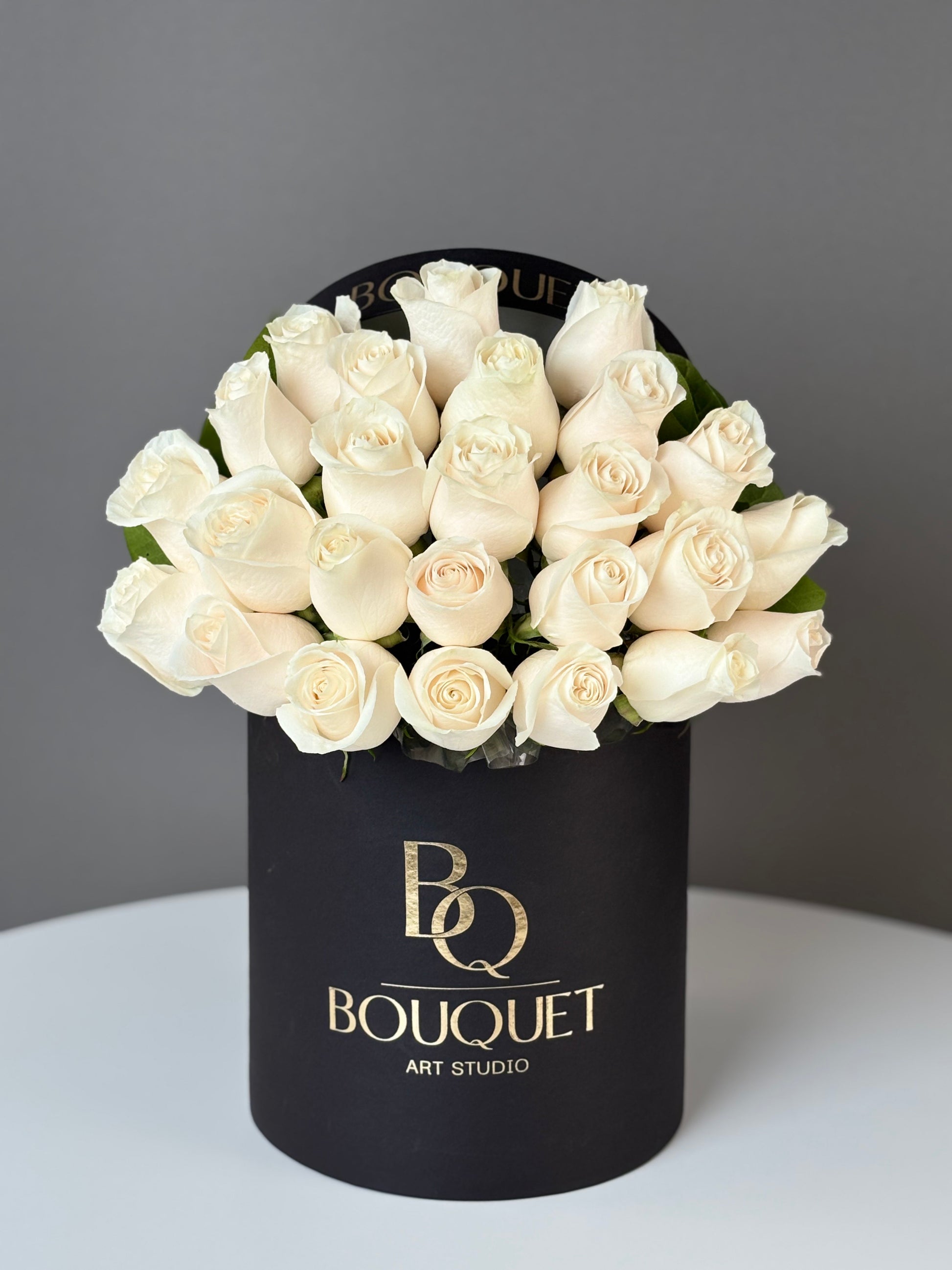 A striking contrast of purity and sophistication. Pristine white blooms paired with a deep matte black hatbox — a timeless visual statement.