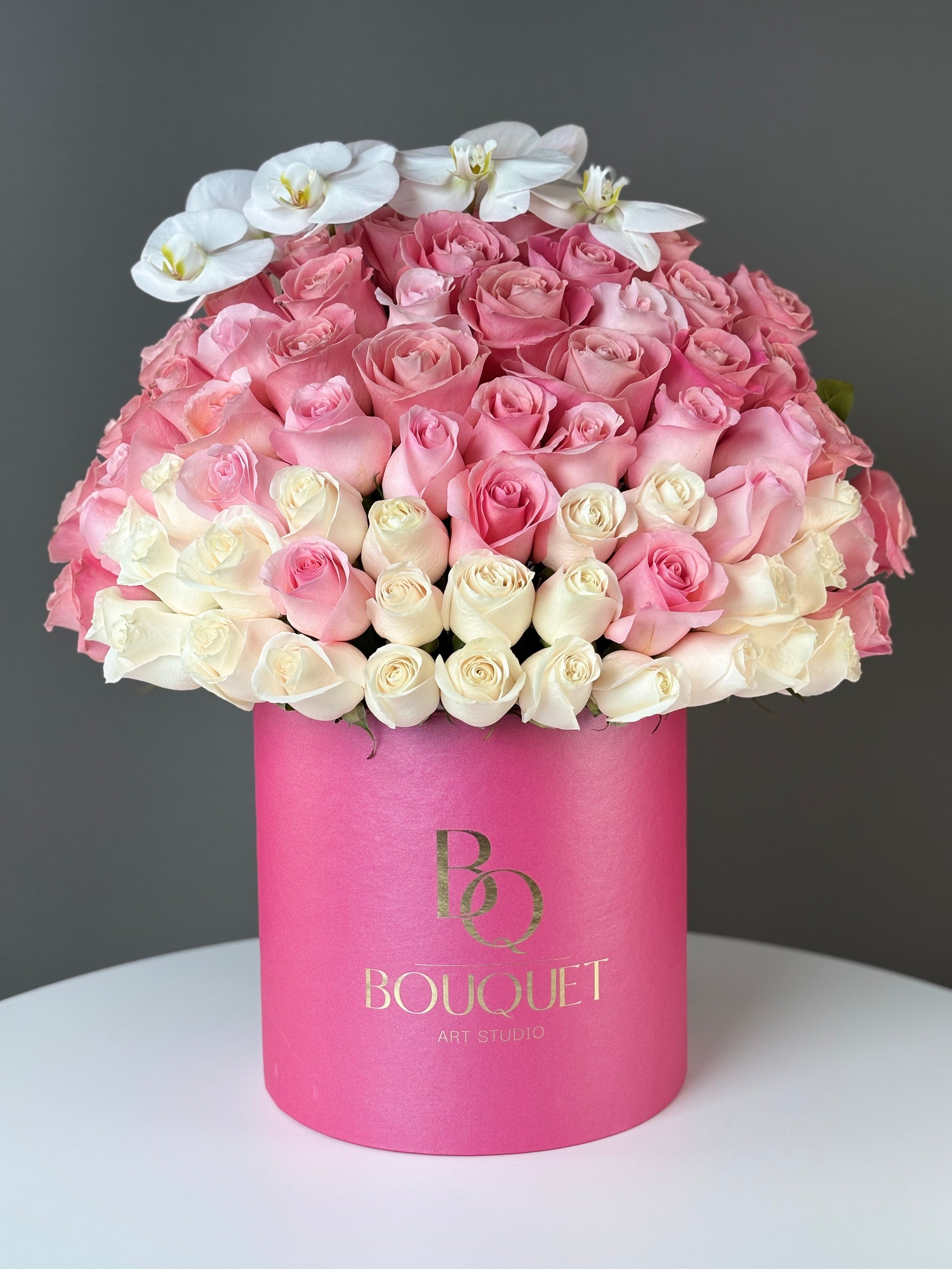 An exquisite fusion of romance and elegance: ivory and blush roses arranged in a smooth ombré gradient, crowned with a cascading white phalaenopsis orchid. Presented in our signature hat box crafted from pearl-effect paper with a soft iridescent sheen and gold-foil BQ logo, Ombre Roses with Orchid is a refined floral masterpiece designed to impress.